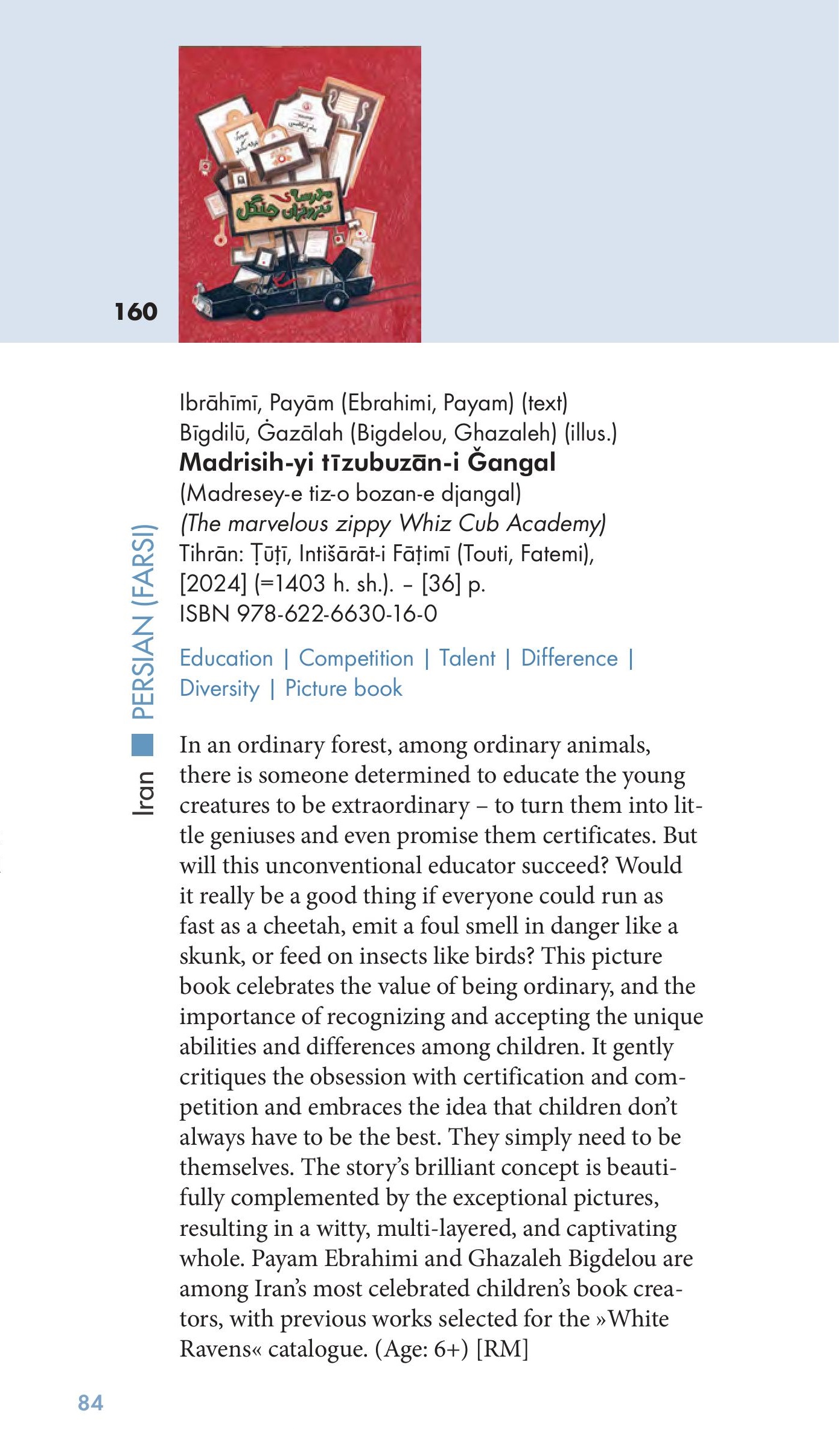 Originally written in Farsi by Payam Ebrahimi and illustrated by Ghazaleh Bigdelou, this picture book is a piece of black humor targeting educational systems insisting on excellence, uniformity, and mastery.